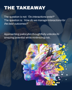 Despite our growing understanding of psilocybin and other psychedelic interactions, identifying an interaction doesn’t automatically mean someone can’t safely engage in psychedelic therapy. In other words, “interaction” does NOT mean “contraindication”. Yet, all too often we fear that learning of an interaction will disqualify someone from psilocybin or other psychedelic therapy, when this most often is not the case. Discovering an interaction simply means further assessment is needed to determine the individualized risk and what to do about it.